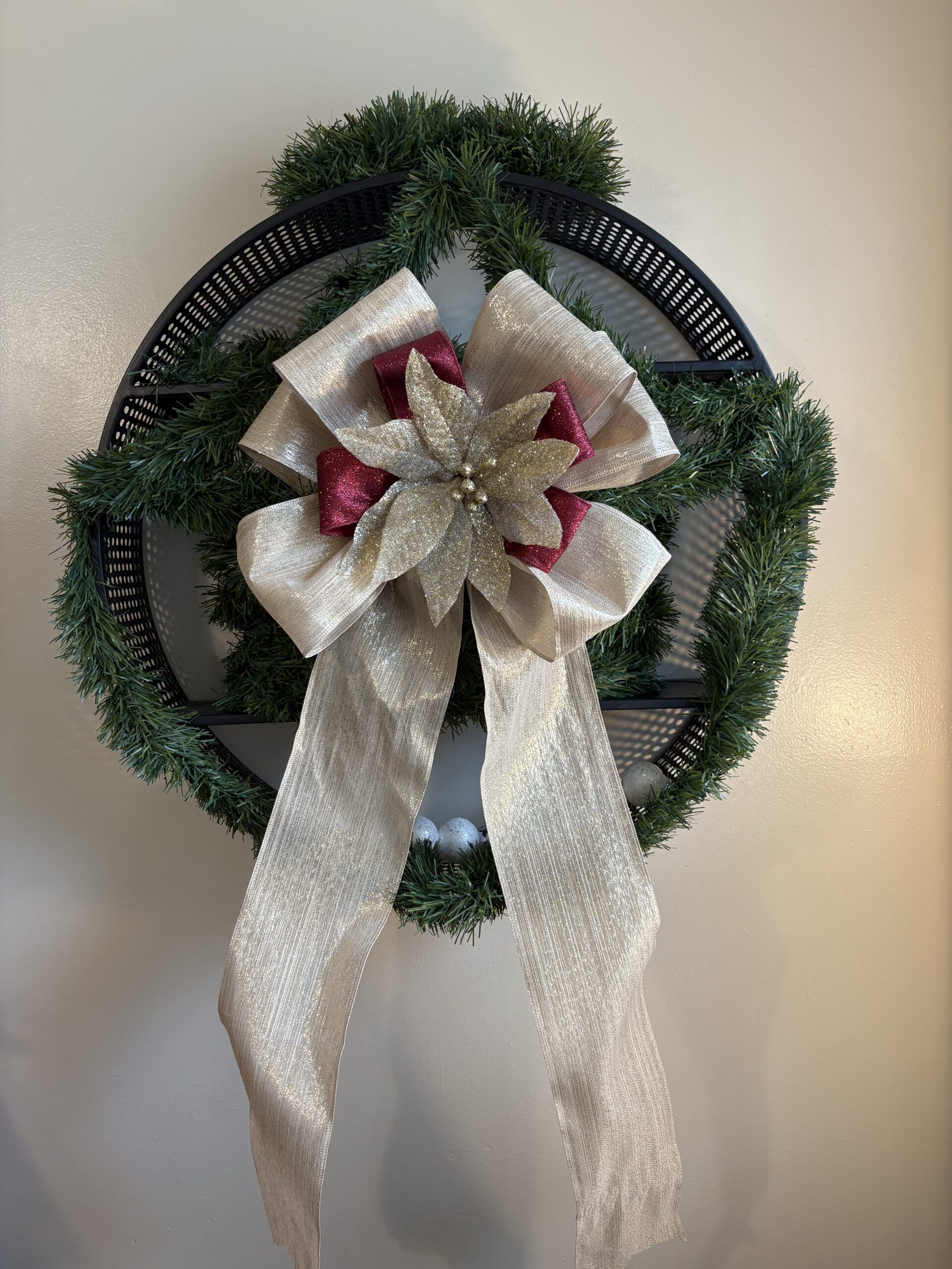 Elevate your holiday decor to a new level of opulence with our spectacular Gold and Ruby Red Poinsettia Christmas Bow. Designed to be a showstopper, this huge, fat bow is handcrafted with luxurious, extra-wide 5-inch ribbon, creating a full and dramatic silhouette that commands attention.
